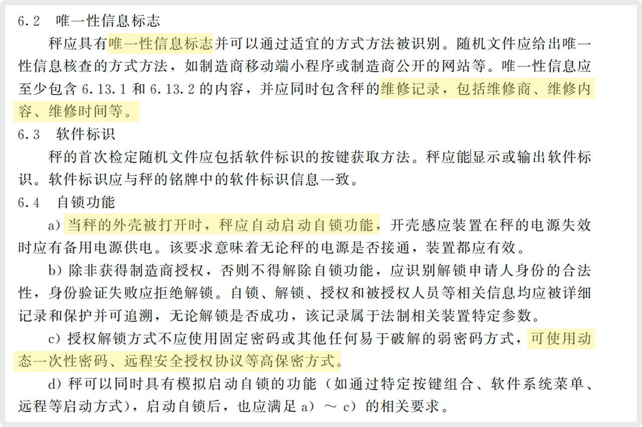 此項(xiàng)要求意味必須在硬件層面具備“非法開(kāi)殼即觸發(fā)鎖死”的功能。任何試圖打開(kāi)外殼以改裝的行為,都將導(dǎo)致設(shè)備無(wú)法使用,解鎖必須通過(guò)官方授權(quán)的動(dòng)態(tài)密碼完成。這從物理根源上終結(jié)了“鬼秤”的制造途徑。